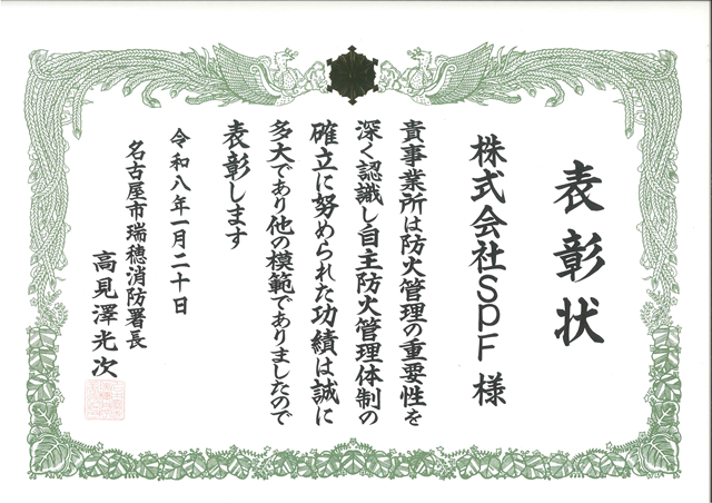 | 2026/1/20 | 【お知らせ】 受賞場所:瑞穂区役所(消防表彰式) 受賞名:優良防火管理事業所 当社はこのたび、消防用設備の適切な維持管理や従業員への防火教育、 避難訓練の実施など、継続的な防火対策が評価され、優良防火管理事業所と して 表彰されました。今後も地域と従業員の安全確保を最優先に、さらなる 防災対策の強化に取り組んでまいります。 |